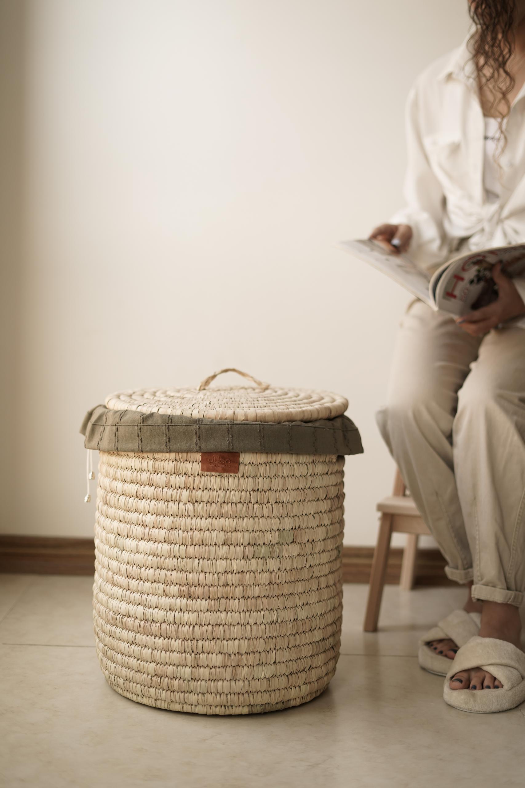 سبد لباس حصیری همراه آستر سبز